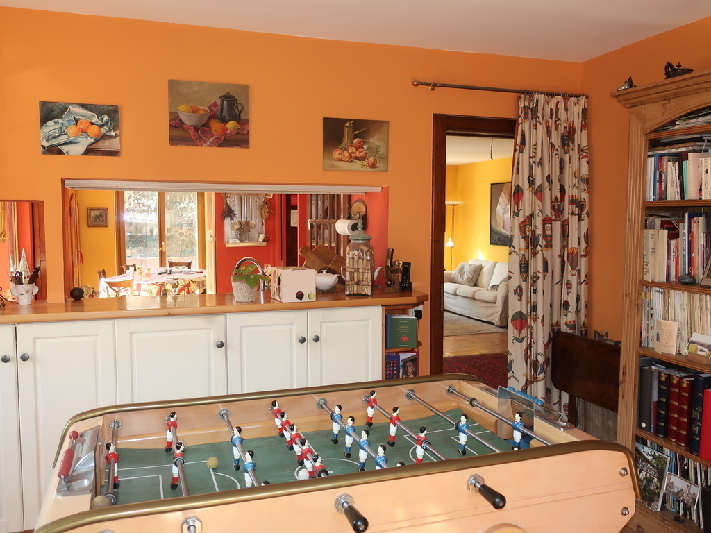Groundfloor has a hall leading to the dining room and to the open kitchen. Door windows lead to the garden and to the terrace. Next to the kitchen is an office with a football table.