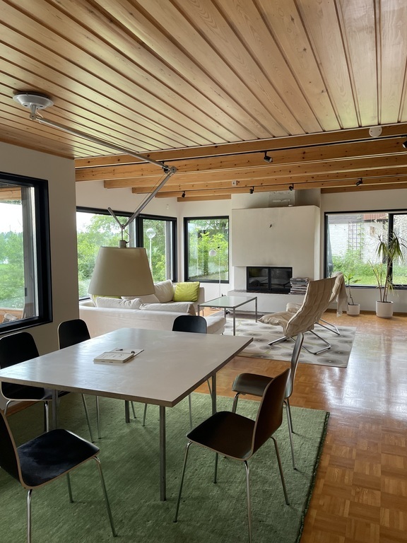 Our house is located in a place with country side feeling, with a view to the river and fields, but only 6 kilometres from the centre of Oulu. The location is beautiful by nature and the house fits the site well. The house was built in 1980 and fully renovated between 2010-2014. The architecture of the house was inspired by Alvar Aalto, and we find the interior beautiful.