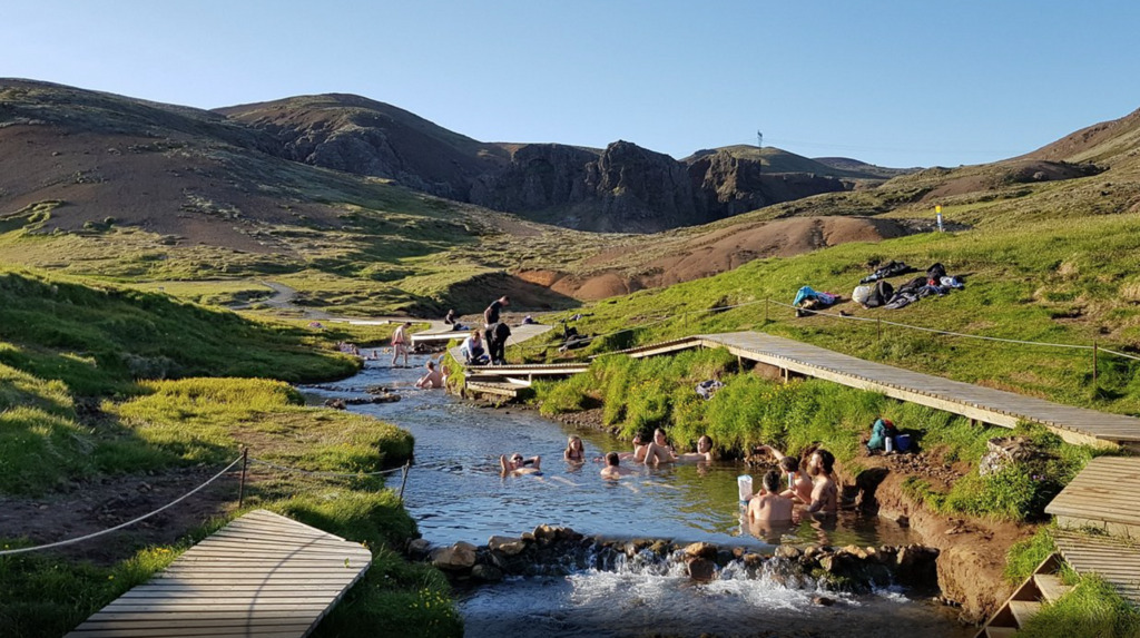 Reykjadalur Hot Springs: This geothermal valley is located just outside of Hveragerði and offers visitors the chance to soak in a natural hot spring river while enjoying stunning views of the surrounding mountains. The hike up to the hot springs is about 3.5 km and takes around 1-2 hours, making it a great outdoor activity for visitors.