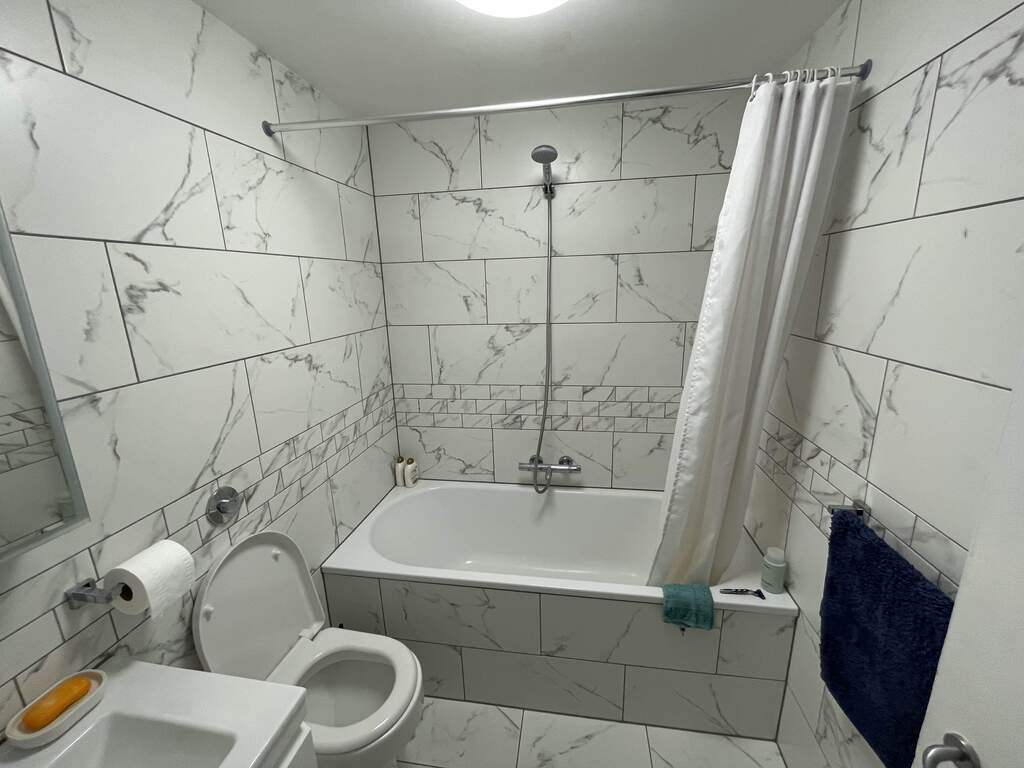 The flat itself has one large bedroom with a kingsize bed and there is a fold out single bed in the living room. The kitchen is well stocked with cooking essentials and there is a dining table with space for 4 people. The bathroom has a bath and shower.