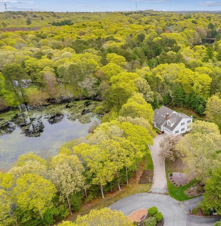 End of a cul de sac road, on a pond. Wooded area surrounds the area.