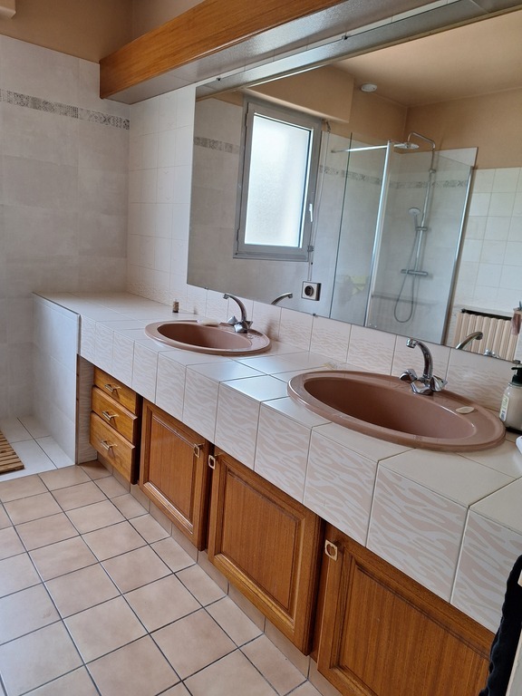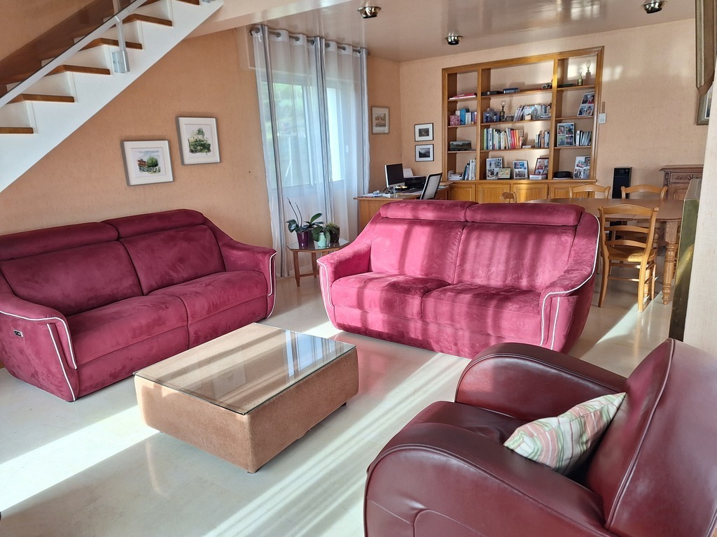séjour/salon avec terrasse, grande cuisine bien équipée avec terrasse sur jardin, 5 chambres, 2 salles de bains, 2 WC.